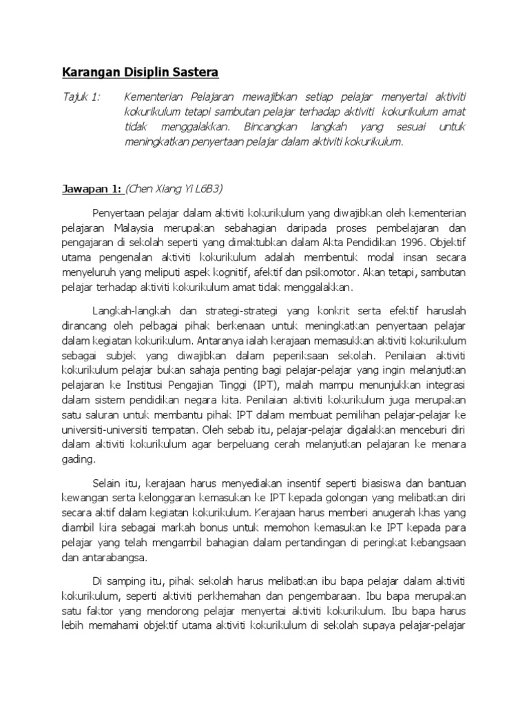Kokurikulum diwujudkan dengan berdasarkan kepercayaan bahawa semua orang harus mempunyai perseimbangan antara perkembangan mental, rohani dan jasmani. Berikut adalah takrifan hasil carian kokurikulum yang boleh didapati dalam kamus tersebut: Aktiviti kokurikulum mempunyai kesan yang positif terutamanya terhadap peningkatan disiplin. Menyediakan prasarana dan pendidikan akademik yang holistik. Kokurikulum merupakan satu saluran pembelajaran yang berasaskan gerak kerja yang terancang. Kokurikulum dapat meningkatkan disiplin pelajar. Kepentingan perhimpunan rasmi sekolah ★(bahagian a spm 2020). Oleh itu, media massa menjadi faktor yang berupaya. Kegiatan kokurikulum ialah aktiviti di luar bilik darjah. Masyarakat semakin kecewa dengan keg agalan. Akhirnya , masalah disiplin pelajar menjadi lebih serius dan mereka terjebak ke dalam kancah pengetua sekolah haruslah memberikan nasihat dan teguran untuk menyedarkan remaja bahawa pentingnya kokurikulum dan akademik dalam. Majlis perhimpunan kokurikulum diadakan pada minggu ke 3 setiap bulan. Disiplin pelajar iaitu suasana sekolah, pengajaran dan pembelajaran, pentadbiran dan guru.