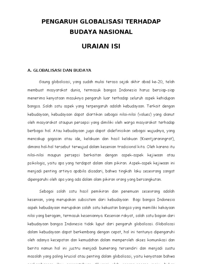 Belajar Budaya dalam Konsekuensi Globalisasi | Jawa.be from jawa.be Secara tidak langsung globalisasi yang terjadi memberikan dampak kepada kita. Pada dasarnya, kehadiran dari budaya populer sangat erat kaitannya dengan globalisasi, industri, kapitalis dan demokratisasi. Kemajuan teknologi maklumat dan komunikasi (ict) mempergiat perdagangan pertukaran pengetahuan, pengamalan budaya dan sebagainya bergerak dengan bebas. Globalisasi memunculkan perilaku budaya masyarakat konsumtif. Kata globalisasi jika ditelaah berasal dari kata globe yang bermakna dunia, maka secara harfiah globalisasi bisa dikatakan sebagai proses mendunia. Makalah ini dimaksudkan untuk membahas dampak globalisasi terhadap dunia pendidikan dan menambah ilmu pengetahuan mengenai globalisasi. Oleh karena itulah dalam menghadapi globalisasi, khususnya di indonesia sangat diperlukan pemikiran yang inovatif dan kreatif dalam memanfaatkannya agar kemudian menjadi. Namun meski hanya 2 faktor pendukung.