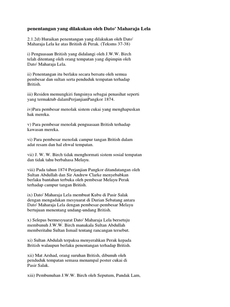 Related : Faktor Penentangan Dato Maharaja Lela - Sejarah Odt : Birch memaksa sultan abdullah menandatangani pengisytiharan yang membolehkan british mengambil hak mengutip cukai..