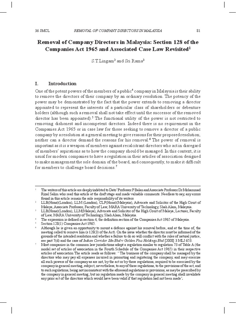 Removal Of Company Directors In Malaysia Section 128 Of The Companies Act 1965 And Associated Case Law Revisited Board Of Directors Articles Of Association from imgv2-2-f.scribdassets.com Section 152a of the companies act 1965. We did not find results for: Check spelling or type a new query. Maybe you would like to learn more about one of these?